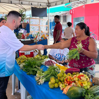 Ao caminhar pela feira, o prefeito conversou com agricultores familiares, pescadores e visitantes, acompanhando de perto a movimentação e a variedade de produtos oferecidos ao público. Entre os itens comercializados estavam peixes frescos, farinha, garapa de cana, frutas, doces típicos e demais produtos regionais que refletem a riqueza da produção local.